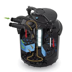 è dotato di un volume interno da 60 lt nel quale sono alloggiate spugne e bioball (queste ultime non comprese nella confezione). Grazie alle 2 lampade uvc integrate da 20 watt (, consente di eliminare anche le alghe unicellulari responsabili del colore verde dell’acqua.