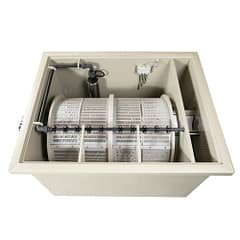 Se il canale dell’acqua sporca dovesse intasarsi a causa di forti presenza di alghe filamentose o foglie, non è un problema semplicemente smontarlo e pulirlo senza smontare il tamburo del filtro o rimuovere il tessuto.