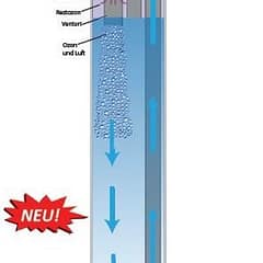 La miscelazione ideale dell’ozono nell’acqua del laghetto avviene tramite un reattore di ozono. L’ozono immesso viene miscelato con l’acqua attraverso due tubi comunicanti. All’ingresso dell’acqua c’è un setaccio divisorio, che fa roteare l’acqua. Ciò consente all’ozono di reagire molto bene con l’acqua. Il reattore di ozono dovrebbe essere sempre azionato con una pompa separata. Se il Reakor è alla luce diretta del sole, coprire la custodia eviterà l’accumulo di alghe.